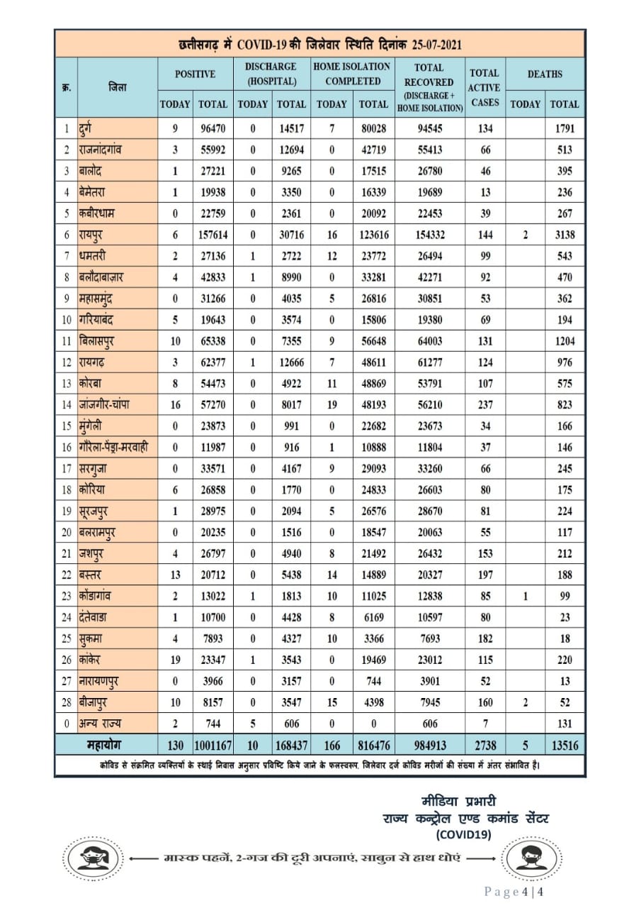 कोरोना ब्रेकिंग: आज सिर्फ 130 नये मरीज…..बस्तर संभाग में सबसे ज्यादा केस…..देखिये प्रदेश का हाल