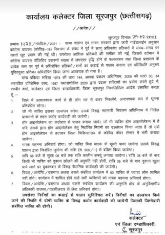 सूरजपुर में नाइट कर्फ्यू का आदेश हुआ जारी