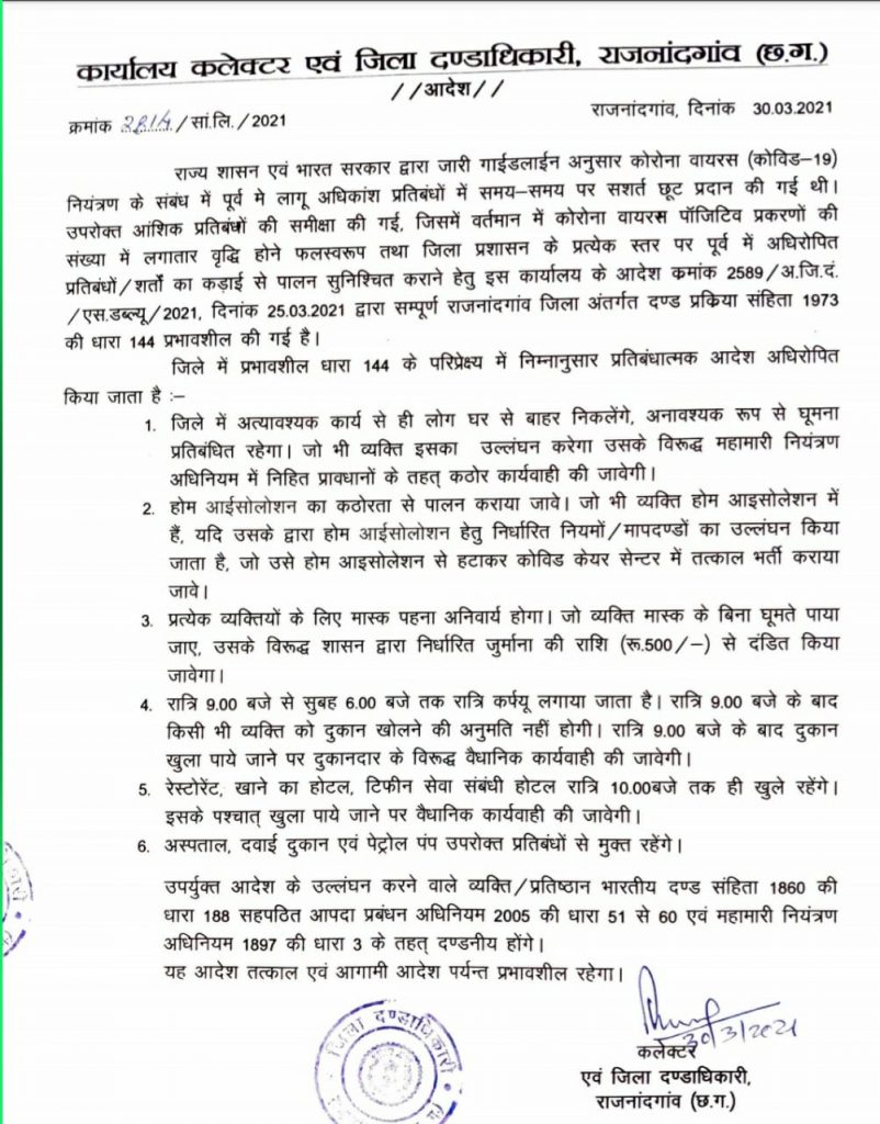राजनांदगांव में नाइट कर्फ्यू का आदेश हुआ जारी