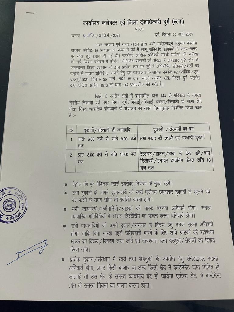 दुर्ग में अब रात 9 बजे तक ही खुली रहेगी दुकानें, आदेश जारी