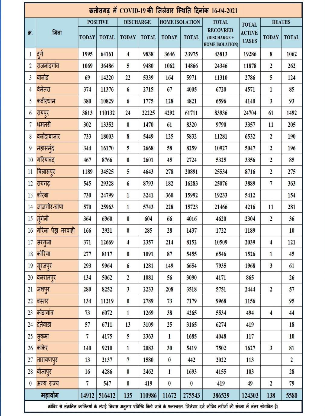 रायपुर में आज 3813 मरीज, दुर्ग में 1995 मरीज जबकि राजनांदगाँव में 1069 मरीज, बिलासपुर में 1189 बलौदा बाज़ार में 733 जबकि सरगुजा में कोविड के इस दौर की ज़बर्दस्त उछाल है आँकड़ा 371 पहुँच गया है। राजधानी में मौत का आँकड़ा 61 है।