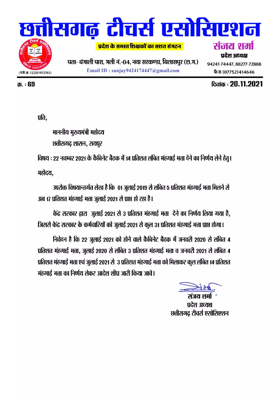 रायपुर 20 नवंबर 2021 I छत्तीसगढ़ टीचर्स एसोसिएशन के प्रदेश अध्यक्ष संजय शर्मा ने मुख्यमंत्री महोदय को ज्ञापन प्रेषित कर 22 नवम्बर 2021 को होने वाले कैबिनेट की बैठक में 14% महंगाई भत्ता का निर्णय लेने की मांग की है।