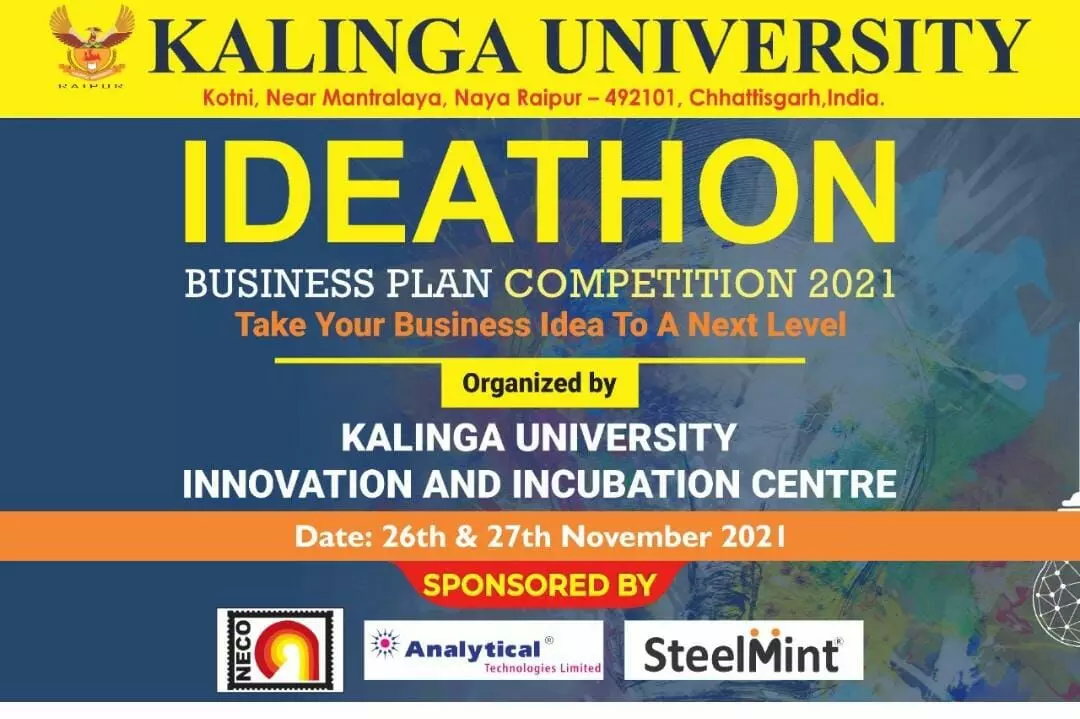 रायपुर 25 नवम्बर 2021। कलिंगा विश्वविद्यालय मध्य भारत का एक प्रतिष्ठित शैक्षणिक संस्थान है। यहाँ पर वैश्विक मापदंड के अनुरूप विद्यार्थियों में नयी खोज को विकसित करने के लिए उच्च गुणवत्तापूर्ण एवं शोधपरक शिक्षा प्रदान किया जाता है। इसी तारतम्य में विश्वविद्यालय के इनोवेशन और इनक्यूबेशन सेल के द्वारा 'आईडिएथन' बिजनेस प्लान प्रतियोगिता का आयोजन किया जा रहा है। जिसमें सर्वोत्तम बिजनेस प्लान देने वाले विद्यार्थियों को प्रमाण पत्र के साथ एक लाख रुपयों से अधिक की नगद राशि से सम्मानित किया जाएगा।