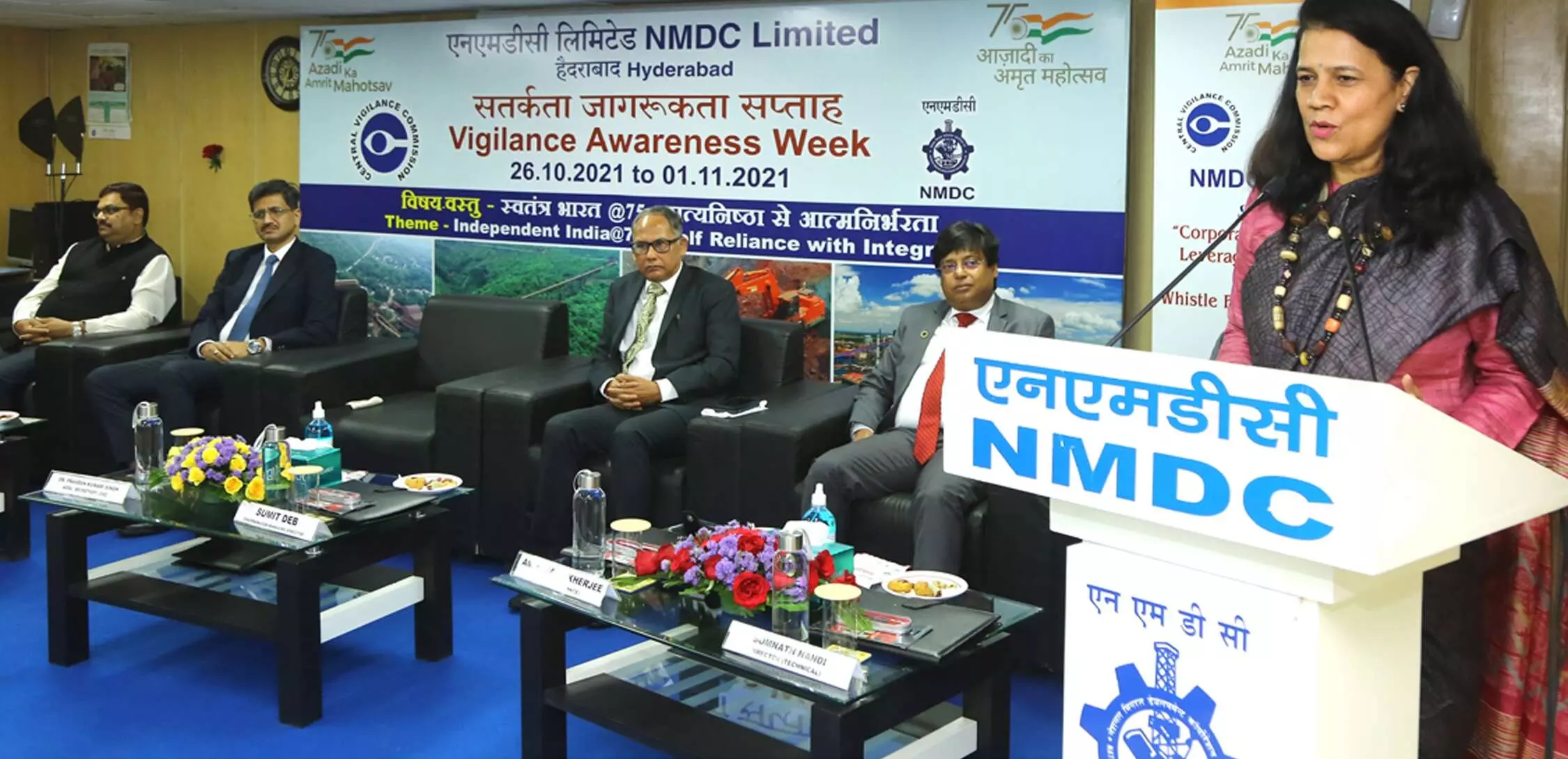 हैदराबाद, 28 अक्तूतबर, 2021। एनएमडीसी ने आज मुख्यालय, हैदराबाद में डॉ प्रवीण कुमारी सिंह, आईएएस, अपर सचिव, केंद्रीय सतर्कता आयोग का स्वागत किया। केंद्रीय सतर्कता आयोग के निदेशों के अनुसार नवरत्न सार्वजनिक उपक्रम 26 अक्टूबर से 1 नवंबर तक सतर्कता जागरूकता सप्ताह - 2021 (वीएडब्यून सा-2021) का आयोजन कर रहा है।