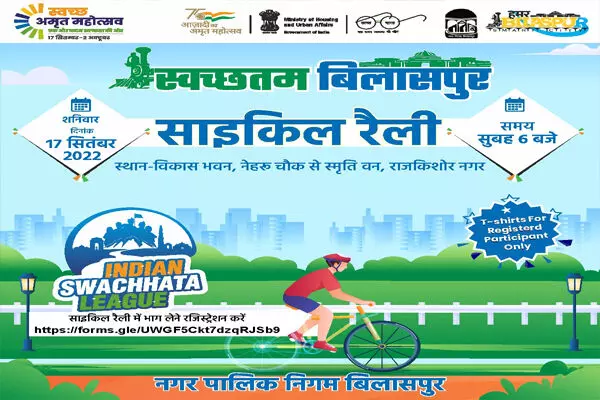 बिलासपुर I केंद्रीय आवास और शहरी मंत्रालय, स्वच्छ भारत मिशन के आठ साल पूरे होने के अवसर पर 17 सितंबर से 15 दिवसीय एक की अभियान शुरू करने जा रहा है । जिसका नाम स्वच्छ अमृत महोत्सव' अभियान है। यह अभियान कचरा मुक्त शहर के लिए नागरिकों की प्रतिबद्धता पर केंद्रित होगा। इसी तारतम्य में शहरवासियों को स्वच्छता के प्रति जागरूक करने और उन्हें जोड़ने के लिए नगर पालिक निगम द्वारा 17 सितंबर को साइकिल रैली "स्वच्छतम बिलासपुर" का आयोजन किया जा रहा है इसके अलावा स्मृति वन राजकिशोर नगर में सामूहिक रूप से साफ-सफाई का कार्य भी किया जाएगा जिसमें जनप्रतिनिधि समेत आम जन शामिल होंगे।