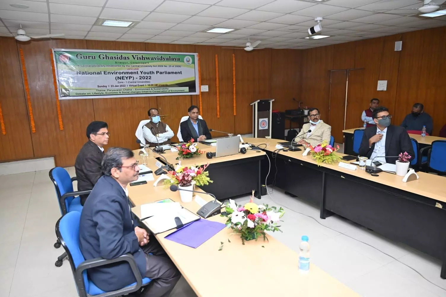 ने आज की पीढ़ी से पर्यावरण के विकास को सर्वदा आगे रखने पर जोर दिया। समाज में पर्यावरण की आवश्यकता पर युवा पीढ़ी के द्वारा किये गये विचारो पर उन्होंने सहमति जाहिर करते हुए कहा की हमारा युवा वर्ग कही न कही जागृत होकर पर्यावरण को आगे बढ़ाएंगे। श्री विष्णु, निदेशक अचानकमार अमरकंटक बायोस्फियर रिज़र्व ने भी अपने विचार रखे हुए प्रतिभागियों को बताया कि युवाओं के मौलिक विचार से ही आगामी कार्य्रकम बनाये जा सकते है निर्णायक मंडल के सदस्य कृष्ण कान्त चंद्रा ने कार्यक्रम में प्रतिभागियों को कहा कि कृषि में रसायन का अधिक उपयोग एवं प्लास्टिक के प्रयोग को आज रोकना कठिन है अतः इसके वैकल्पिक उपयोग हेतु युवाओ को विचार करना होगा I पेड़ो के लगाने से लेकर उसके संरक्षण पर अधिक बल दिया जाना चाहिए I युवा संसद के राष्ट्रिय प्रतियोगिता के समन्वयक डॉ के के चंद्रा ने प्रतियोगिता के बारे में जानकारी देते हुए स्वागत भाषण प्रस्तुत किया I डॉ अमित खास्कलम ने नियमों की जानकारी दी। डॉ गरिमा तिवारी ने कार्यक्रम का संचालन किया व डॉ भावना दीक्षित ने धन्यवाद ज्ञापन किया I