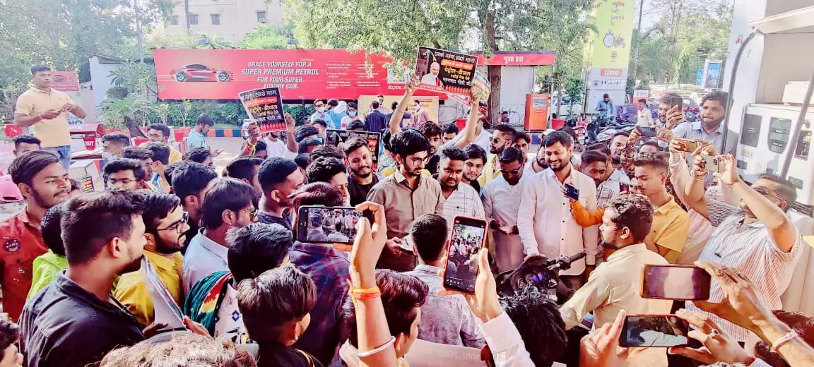रायपुर, 20 अक्टूबर 2021। पेट्रोल-डीजल की बढ़ती कीमत के विरोध में बुधवार को छत्तीसगढ़ युवा कांग्रेस ने अनोखे ढंग से विरोध प्रदर्शन किया। युवा कांग्रेस के अध्यक्ष पूर्णचंद कोको पाढ़ी और रायपुर जिला युवा कांग्रेस के अध्यक्ष स्वप्निल मिश्रा के नेतृत्व में तेलीबांधा तालाब से लगे पेट्रोल पंप में युकां कार्यकर्ता नोटों की थाल और नारियल अगरबत्ती लेकर पहुंचे और पेट्रोल भरवा रहे लोगों की पहले नजर उतारी, फिर उनकी पूजा करते हुए नारियल देकर सम्मानित किया। मीडिया से बात करते हुए कोको पाढ़ी ने बताया कि पेट्रोल-डीजल की कीमतें आसमान की ऊंचाइयों को पार कर अंतरिक्ष की ओर अग्रसर है। केंद्र सरकार के खिलाफ विरोध दर्ज कराने के लिए छत्तीसगढ़ युवा कांग्रेस द्वारा सभी जिला और विधानसभा मुख्यालयों में विरोध प्रदर्शन किया गया। इस दौरान प्रदेश प्रभारी महासचिव अशरफ हुसैन, गुलजेब अहमद, प्रदेश प्रवक्ता अंशुल पांडे, आयुष पांडेय, विपुल चौबे, रोशन खान, मिहिर सोनी, आशीष, विशाल आदि उपस्थित थे।