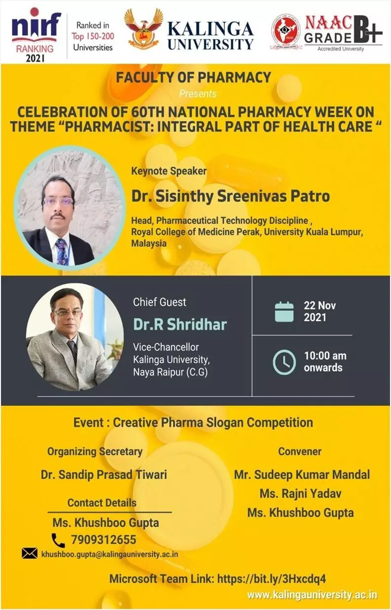 राष्ट्रीय फार्मेसी सप्ताह के उपलक्ष्य में कलिंगा विश्वविद्यालय के फार्मेसी संकाय ने द्वारा ''फार्मासिस्टः स्वास्थ्य देखभाल का अभिन्न अंग'' थीम पर वेबीनार का आयोजन किया गया। कार्यक्रम में डॉ. आर. श्रीधर कुलपति, कलिंगा विश्वविद्यालय मुख्य अतिथि के रूप में उपस्थित थे तथा मुख्य वक्ता डॉ. सिसिंथी श्रीनिवास पात्रो थे।