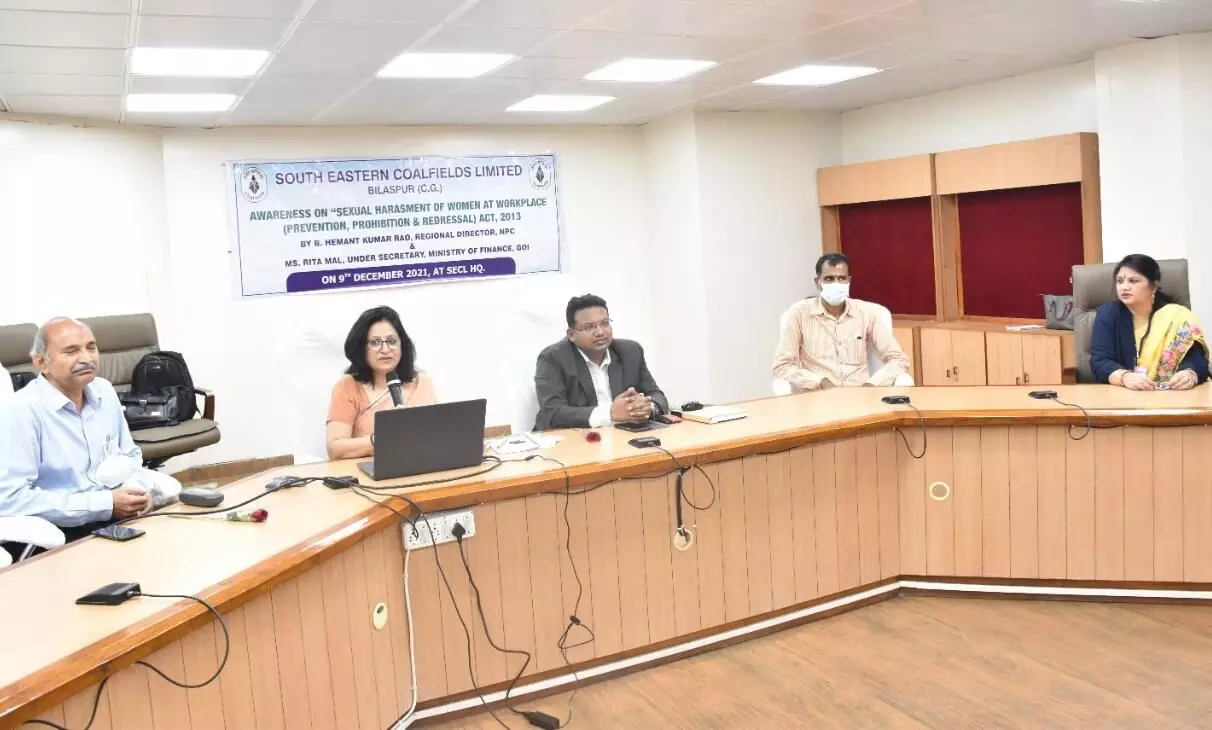 बिलासपुर 9 दिसम्बर 2021. को कार्यालय में कार्यरत महिलाओं के लिए विडियो कान्फ्रेन्सिंग के जरिए सीएमडी सभा कक्ष तृतीय तल में कार्यस्थल पर महिलाओं के यौन उत्पीड़न रोकथाम, निषेध और निवारण विषय पर एक दिवसीय कार्यशाला का आयोजन किया गया। इस अवसर पर वाह्य अतिथि अवर सचिव, वित्त मंत्रालय भारत सरकार से माननीया रीता मल एवं क्षेत्रीय निदेशक एनसीपी बी. हेमंत कुमार राव ने अपने सारगर्भित विचार रखे। कार्यक्रम में के प्रवीण कुमार महाप्रबंधक मानव संसाधन विकास विभाग की उल्लेखनीय उपस्थिति रही। अतिथियों का स्वागत संगीता बझलवार, नमिता दीक्षित, पूजा गुप्ता द्वारा पुष्पगुच्छ से किया गया तथा कार्यक्रम के अंत में उपस्थितों को धन्यवाद ज्ञापित मीना लोचानी द्वारा प्रस्तुत किया गया। उपस्थित महिला प्रतिभागियों एवं विडियो कान्फ्रेसिंग से जुड़ी महिला कर्मियों ने इस व्याख्यान को अत्यंत लाभप्रद बताया।