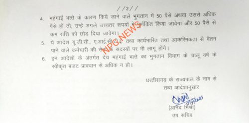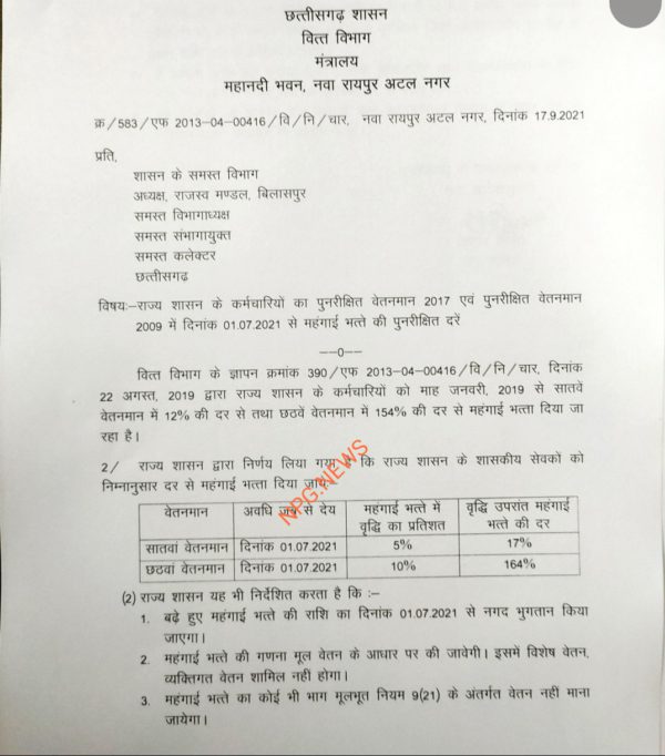 रायपुर,17 सितंबर 2021। राज्य सरकार ने आदेश जारी कर महंगाई भत्ते की दर निर्धारित कर उसके भुगतान किए जाने के निर्देश दिए हैं। सातवाँ वेतनमान और छठवें वेतनमान के लिए अलग अलग दरें हैं।