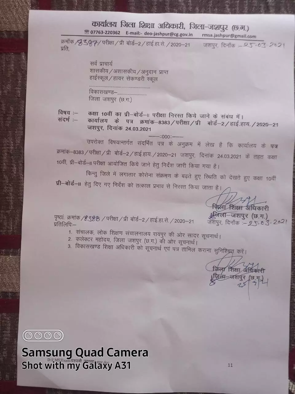गौरतलब है कि पूरे प्रदेश में कोरोना का संक्रमण फैलता ही जा रहा है और मुख्यमंत्री ने कैबिनेट बैठक लेकर तत्काल प्रभाव से सभी ऑनलाइन पढ़ाई को स्थगित कर दिया है ऐसे में जशपुर जिला शिक्षा अधिकारी ने बेतुका सा आदेश जारी करते हुए 26 मार्च से दसवीं का प्री बोर्ड आयोजित कर दिया था जिसमें छात्र सुबह 10 बजे स्कूल गेट पर इकट्ठा होकर प्रश्न पत्र और उत्तर पुस्तिकाएं ले जाते और घर से लिख कर वापस अगले दिन उसे विद्यालय में जमा करते , इस बाबत न्यूपावरगेम में खबर प्रसारित होने के बाद अब जशपुर जिला शिक्षा अधिकारी ने अपने आदेश को निरस्त कर दिया है