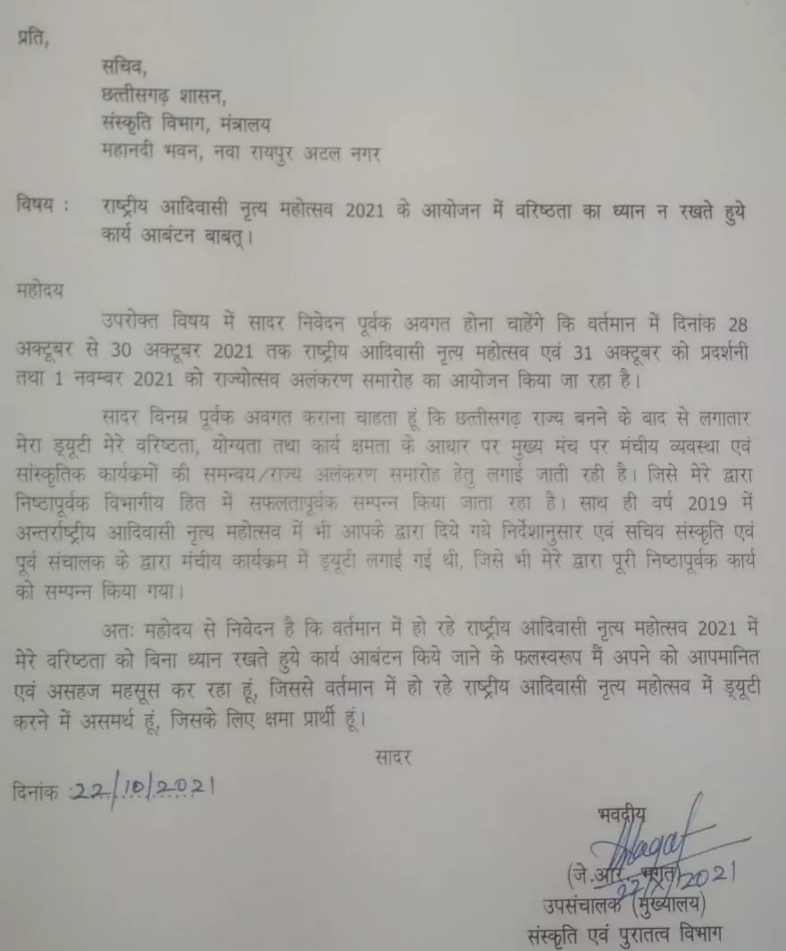 "…साथ ही वर्ष 2019 में अंतर्राष्ट्रीय आदिवासी नृत्य महोत्सव में भी आपके द्वारा मंचीय कार्यक्रम में मेरी ड्यूटी लगाई गई थी..वर्तमान में हो रहे राष्ट्रीय आदिवासी नृत्य महोत्सव में मेरी वरिष्ठता को बिना ध्यान रखते हुए कार्य आबंटन किये जाने के फलस्वरूप मैं अपने को अपमानित एंव असहज महसूस कर रहा हूँ जिससे वर्तमान में हो रहे राष्ट्रीय आदिवासी नृत्य महोत्सव में ड्यूटी करने में असमर्थ हूँ"