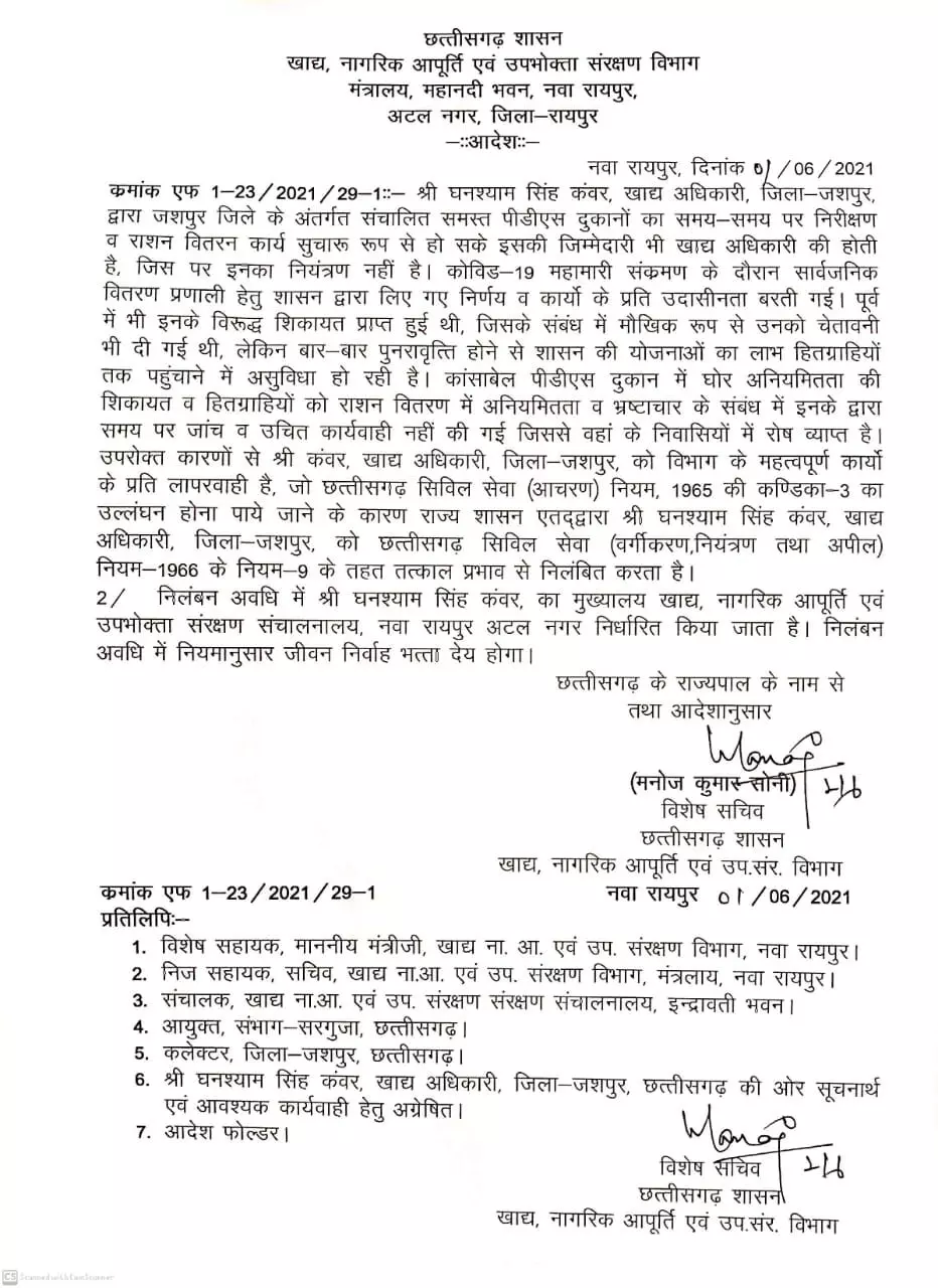 रायपुर,3 जून 2021। जशपुर के ज़िला खाद्य अधिकारी घनश्याम सिंह कँवर को विभागीय मंत्री के निर्देशों और फ़ोन कॉल की लगातार अवहेलना भारी पड़ गई है। मंत्री अमरजीत भगत ने ज़िला खाद्य अधिकारी घनश्याम सिंह कँवर को सस्पेंड कर दिया है।