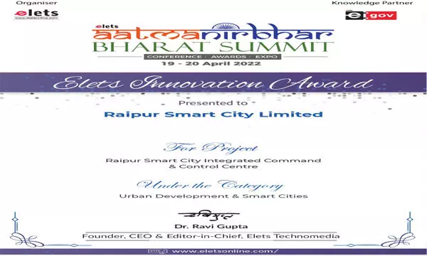रायपुर 09 मई 2022। आत्मनिर्भर भारत समिट में अर्बन डेवलपमेंट एण्ड स्मार्ट सिटीस के अंतर्गत रायपुर स्मार्ट सिटी लिमिटेड के प्रोजेक्ट इंटीग्रेटेड कमाण्ड एण्ड कंट्रोल सेंटर को इनोवेशन अवार्ड प्राप्त हुआ है यह अवार्ड टेक्सटाइल मंत्रालय भारत सरकार के सचिव यू.पी. सिंह द्वारा प्रदान किया गया। सम्मेलन का आयोजन नई दिल्ली में हुआ, जिसमें देश भर के स्मार्ट सिटी और विभागों ने भाग लिया।