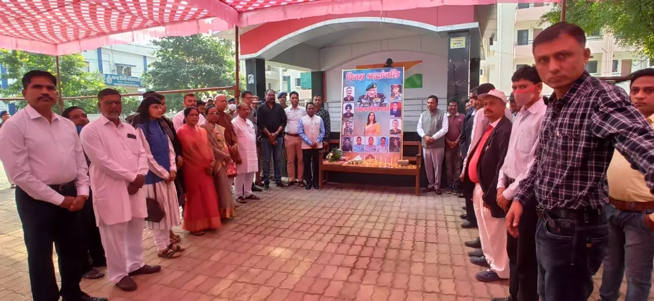 धमतरी 11 दिसम्बर 2021। गत दिनों तमिलनाडु में हुए हेलीकॉप्टर क्रैश में देश के सीडीएस जनरल बिपिन रावत उनकी पत्नी मधुलिका रावत,ब्रिगेडियर लखविंदर सिंह ,लेफ्टिनेंट कर्नल हरजिंदर सिंह ,लांस नायक विवेक कुमार ,बी साईं तेजा ,नायक गुरु सेवक सिंह,जितेंद्र कुमार, हवलदार सतपाल राय, विंग कमांडर पीएस चौहान, स्क्वाड्रन लीडर कुलदीप सिंह, जेडब्लूओ राणा प्रताप दास, प्रदीप अधिकारियों की असामयिक मृत्यु हो गई। देश उनके निधन से शोकाकुल है। धमतरी में भी लगातार श्रद्धांजलि कार्यक्रम आयोजित किए जा रहे हैं।
