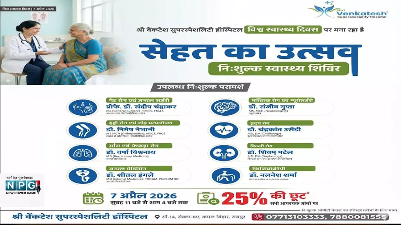 रायपुर: विश्व स्वास्थ्य दिवस के अवसर पर श्री वेंकटेश सुपरस्पेशलिटी हॉस्पिटल द्वारा 7 अप्रैल 2026 को “सेहत का उत्सव” थीम के तहत एक भव्य निःशुल्क स्वास्थ्य शिविर का आयोजन किया जा रहा है। यह शिविर सुबह 11 बजे से शाम 4 बजे तक आयोजित होगा, जिसमें शहर के अनुभवी एवं विशेषज्ञ डॉक्टर विभिन्न बीमारियों के लिए मुफ्त परामर्श देंगे।