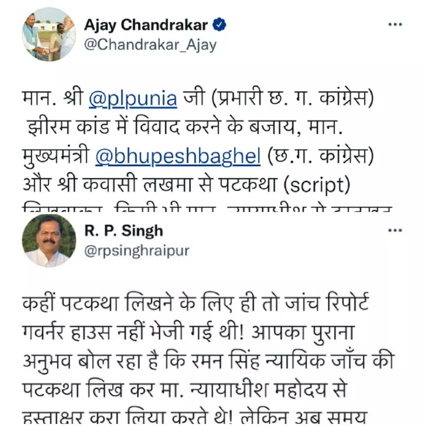 "मान. श्री @plpunia जी (प्रभारी छ. ग. कांग्रेस)झीरम कांड में विवाद करने के बजाय, मान. मुख्यमंत्री @bhupeshbaghel (छ.ग. कांग्रेस) और श्री कवासी लखमा से पटकथा (script) लिखवाकर, किसी भी मान. न्यायाधीश से दस्तखत करवाकर तुरंत कार्यवाही कर देना चाहिए.. दोनों चलते फिरते जिंदा सबूत हैं।"