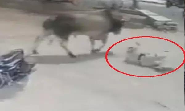 पुलिस कॉन्स्टेबल पर हमला: ड्यूटी के दौरान पीछे से बैल ने मारी जोरदार टक्कर, हवा में उछला सिपाही, सीसीटीवी में कैद हुआ डरावना वीडियो