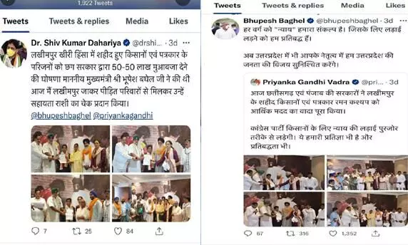 कैबिनेट मंत्री शिव डहरिया ने लखीमपुर पहुँच कर लखीमपुर हादसे में मारे गए किसानों और स्वतंत्र पत्रकार के परिजनों को पचास पचास लाख मुआवज़े का चेक सौंपा है।मंत्री शिव डहरिया ने इसे ट्वीट भी किया है।श्रीमती प्रियंका गांधी वाड्रा ने आर्थिक मदद के वादे को पूरा करने का ट्वीट किया जिसे CM भूपेश बघेल ने रिट्वीट कर कहा है "हर वर्ग "न्याय" हमारा संकल्प है, जिसके लिए लड़ाई लड़ने को हम प्रतिबद्ध हैं,अब उत्तर प्रदेश में भी आपके नेतृत्व में हम उत्तर प्रदेश की जनता की विजय सुनिश्चित करेंगे"