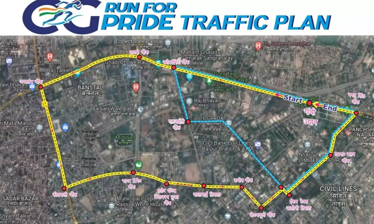 राजधानी के गांधी उद्यान के पास मुख्यमंत्री ने दौड़ को हरी झंडी दिखाई। भगत सिंह चौक से शुरू होकर यह दौड़ दो अलग-अलग मार्गों से गुजरकर फिर अपने प्रारंभिक स्थल भगत सिंह चौक पर लौटेगी। दौड़ को मुख्य रूप से दो श्रेणियों में बांटा गया है, इसमें एक 5 किलोमीटर की दौड़ महिला-पुरुष श्रेणी में होगी। इसमें 14 वर्ष से 60 वर्ष तक के आयु वर्ग के लोग शामिल होंगे। इस वर्ग के प्रतिभागियों के लिए जयस्तंभ चौक, कोतवाली चौक, पी.डब्लू.डी. चौक (मजार चौक), इनकम टैक्स कॉलोनी तिराहा और शहीद भगत सिंह चौक को चेक पॉइंट बनाया गया है। जिसमें प्रथम पुरस्कार 21 हजार रुपए, द्वितीय पुरस्कार 15 हजार रुपए, तृतीय पुरस्कार 11 हजार रुपए व चतुर्थ से दसवें स्थान तक 21 सौ रुपए पुरस्कार राशि प्रदान की जाएगी। वहीं वरिष्ठ नागरिक व 14 साल से कम उम्र के बच्चों की एक श्रेणी रखी गई है।