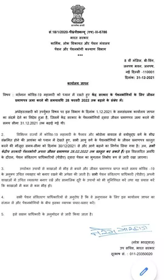 कोरोना इफेक्ट: केंद्रीय कर्मचारियों के लिए जीवन प्रमाण पत्र जमा करने की मियाद अब 28 फ़रवरी तक बढ़ाई गई