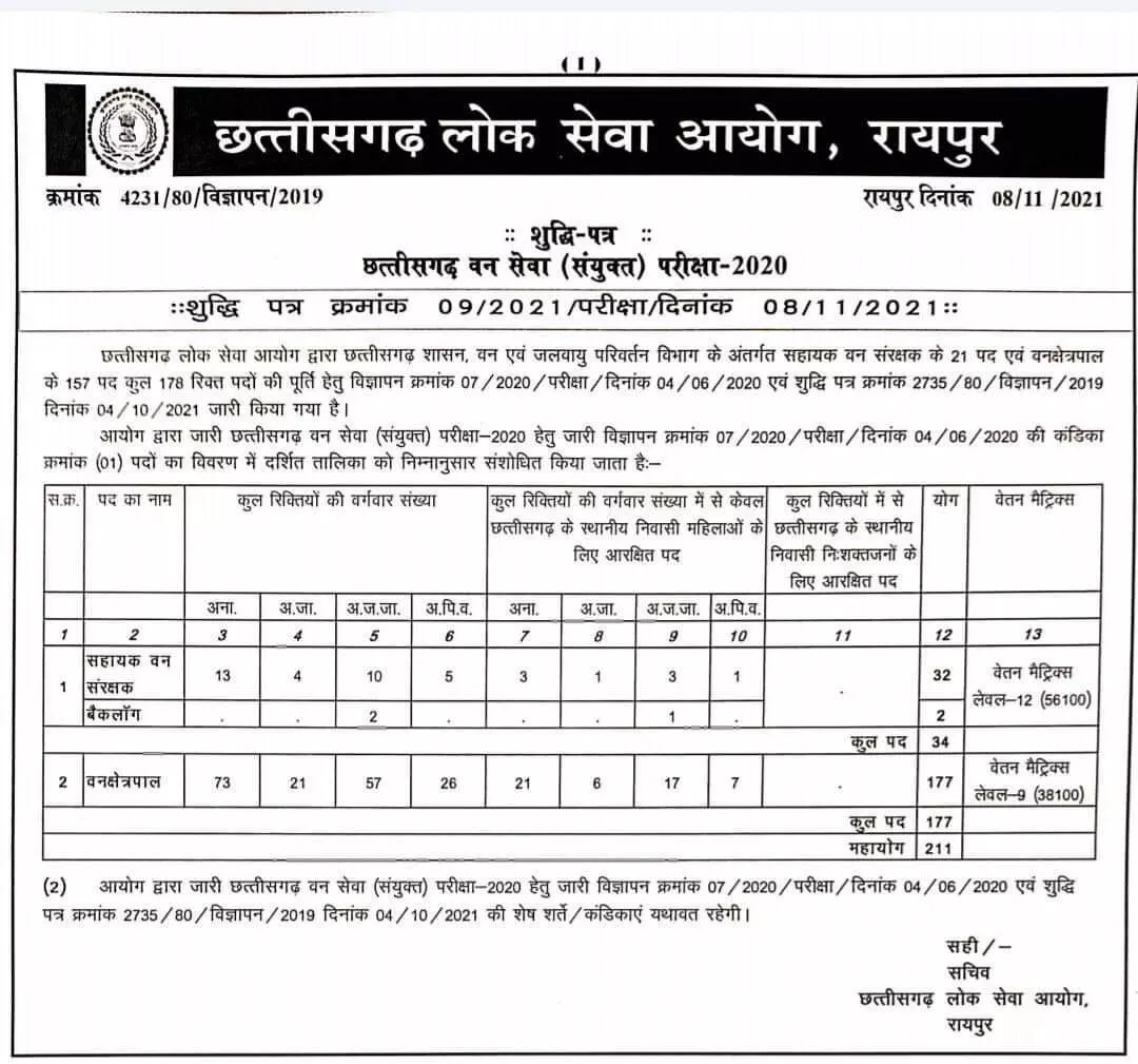 रायपुर, 9 नवंबर 2021। पीएससी द्वारा आयोजित होने वाली वन सेवा परीक्षा के पद बढा दिए गए हैं। 5 दिसम्बर को होने वाली परीक्षा के लिए 178 पद विज्ञापित किये गए थे। जिनमें फारेस्ट एसडीओ व रेंजर के अलग अलग पद पर भर्ती निकाले गए थे। कल पीएससी ने शुद्धि पत्र जारी कर पद बढ़ा दिये है अब सहायक वन सरंक्षक के बैकलॉग समेत कुल 34 पदों पर व रेंजर के 177 पदों पर भर्ती होने वाली हैं। अर्थात अब 178 पदों पर होने वाली भर्ती अब सहायक वन सरंक्षक व रेंजर के कुल 211 पदों के लिए होगी।