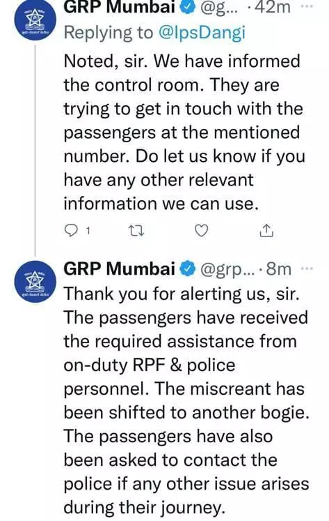 "हमें सचेत करने के लिए धन्यवाद सर। यात्रियों को ऑन-ड्यूटी आरपीएफ और पुलिस कर्मियों से आवश्यक सहायता प्राप्त हो गई है। शरारती तत्व को दूसरी बोगी में शिफ्ट कर दिया गया है। उन यात्रियों से यह भी कहा गया है कि अगर उनकी यात्रा के दौरान कोई अन्य समस्या आती है तो वे तत्काल पुलिस से संपर्क करें।"