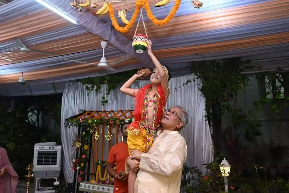 जन्माष्टमी पर्व पर मुख्यमंत्री के भिलाई-3 स्थित कैम्प कालोनी में भी पूजा का आयोजन किया गया था। इस दौरान वहां का वातावरण गोकुल के समान हो गया था। विधि विधान से की गई पूजा अर्चना के बाद यहां मटकी फोड़ का भी आयोजन किया गया था। इस दौरान मुख्यमंत्री के नाती यानी उनके बेटी के पुत्र अथर्व बाल-कान्हा के रूप में थे। बाल कान्हा बने अथर्व सभी का मन मोह रहे थे। पूजा के बाद मटकी फोड़ने के समय सीएम नाना भूपेश ने नाती अथर्व को अपनी गोद मे उठा लिया। फिर मुख्यमंत्री ने अपने नाती अथर्व को अपनी गोद में उठा कर मटकी फोड़वाई।