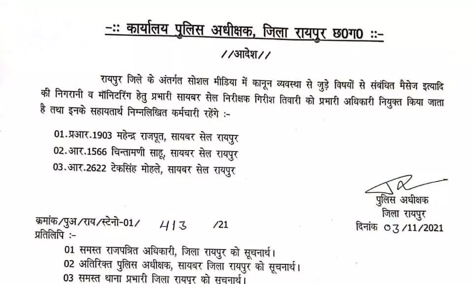 रायपुर,3 नवंबर 2021। राजधानी पुलिस ने सोशल मीडिया पर निगरानी और मॉनिटरिंग सेल का गठन किया है। इसके प्रभारी सायबर सेल टीआई गिरीश तिवारी होंगे। इस टीम में प्रधान आरक्षक महेंद्र राजपुत,आरक्षक चिंतामणि साहू और आरक्षक टेक सिंह मोहले शामिल किये गए हैं।