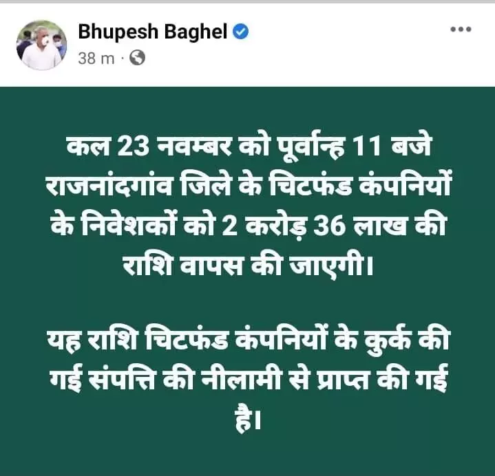 चिटफंड निवेशकों को राशि कल खाते में होगा ट्रांसफर, मुख्यमंत्री कल राजनांदगांव के 16 हजार लोगों के खाते में ट्रांसफर करेंगे ढाई करोड़ रुपए...ट्वीट कर दी जानकारी
