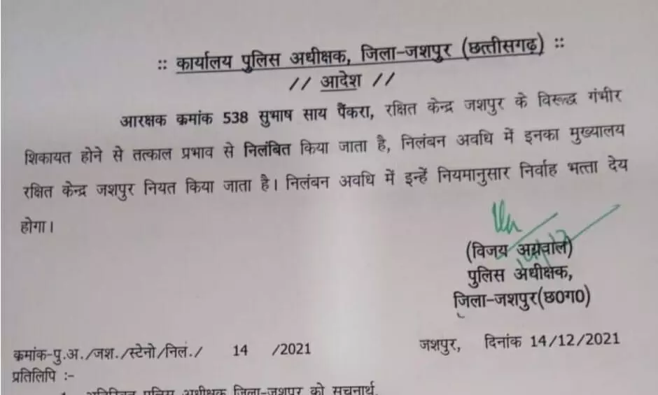 जशपुर 14 दिसम्बर 2021। शिक्षिका की बेटी की फ़ोटो खिंच कर शिक्षिका को मानसिक रूप से परेशान करने वाले आरक्षक को एसपी ने निलंबित किया है। कल इस मामले में शिक्षिका ने तपकरा थाने में भी शिकायत की थी जिसके बाद शिकायत को संज्ञान में लेकर पुलिस अधीक्षक विजय अग्रवाल ने यह कार्यवाही की हैं।