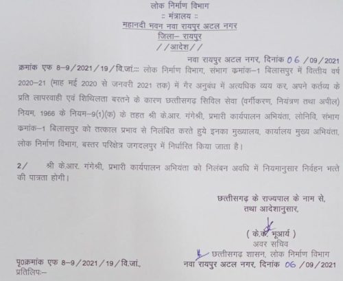 रायपुर 6 सितंबर 2021। पीडब्ल्यूडी विभाग में पदस्थ बिलासपुर के प्रभारी कार्यपालन अभियंता को निलबित कर दिया गया है। कार्यपालन अभियंता के खिलाफ बिना अनुबंध केे राशि का भुगतान करने और लापरवाही की शिकायत मिली थी। इस शिकायत के बाद पीडब्ल्यूडी मंत्री ताम्रध्वज साहू ने कारवाई करते हुये कार्यपालन अभियंता केआर गंगत्री को तत्काल प्रभाव से सस्पेंड कर दिया गया। निलंबन के दौरान अधिकारी का मुख्यालय जगदलपुर रहेगा।