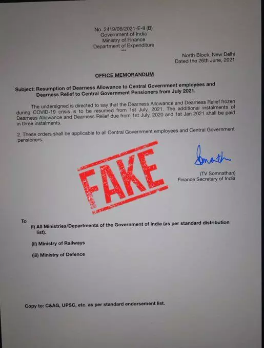 𝗧𝗵𝗶𝘀 𝗢𝗠 𝗶𝘀 #𝗙𝗔𝗞𝗘. 𝗡𝗼 𝘀𝘂𝗰𝗵 𝗢𝗠 𝗵𝗮𝘀 𝗯𝗲𝗲𝗻 𝗶𝘀𝘀𝘂𝗲𝗱 𝗯𝘆 𝐆𝐎𝐈. pic.twitter.com/HMcQVj81Sf— Ministry of Finance (@FinMinIndia) June 26, 2021