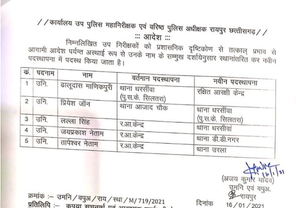 रायपुर 16 जनवरी 2021। एसएसपी अजय यादव ने पांच उप निरीक्षकों की ट्रांसफर लिस्ट जारी की है। जारी सूची में पांच एसआई के नाम शामिल है…
