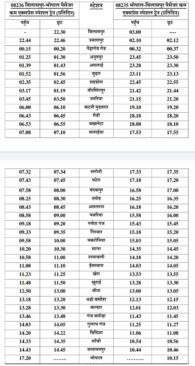 बिलासपुर/रायपुर 6 सितम्बर 2021। रेलवे प्रशासन द्वारा रेल यात्रियों की सुविधा को ध्यान में रखते हुये बिलासपुर-भोपाल-बिलासपुर पैसेंजर-एक्सप्रेस स्पेशल ट्रेन (प्रतिदिन) का परिचालन प्रारम्भ किया जा रहा है । गाड़ी संख्या 08236 बिलासपुर-भोपाल पैसेंजर कम एक्सप्रेस स्पेशल ट्रेन (प्रतिदिन) बिलासपुर से दिनांक 17 सितम्बर, 2021 से तथा गाड़ी संख्या 08235 भोपाल-बिलासपुर पैसेंजर कम एक्सप्रेस स्पेशल ट्रेन (प्रतिदिन) भोपाल से दिनांक 19 सितम्बर, 2021 से रवाना होगी ।