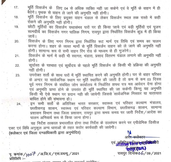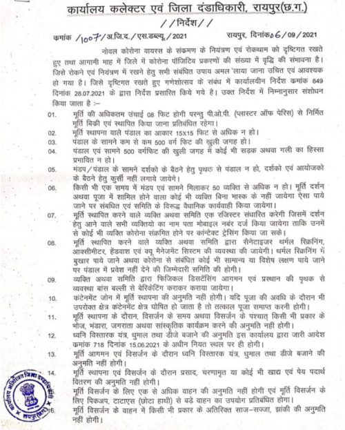 रायपुर 6 सितंबर 2021। राजधानी में गणेश उत्सव को लेकर कलेक्टर ने आदेश जारी किया है। जारी आदेश के मुताबिक अब चार फीट गणेश की मूर्ति की जगह आठ फीट की मूर्ति पंडालों में बैठा पाएंगे। साथ ही नियम और शर्तों के आधार पर धुमाल बजाने की भी अनुमति होगी, लेकिन निर्धारित स्थान पर ही बजा पाएंगे धुमाल और डीजे। पढ़े जारी पूरी गाइडलाइन….
