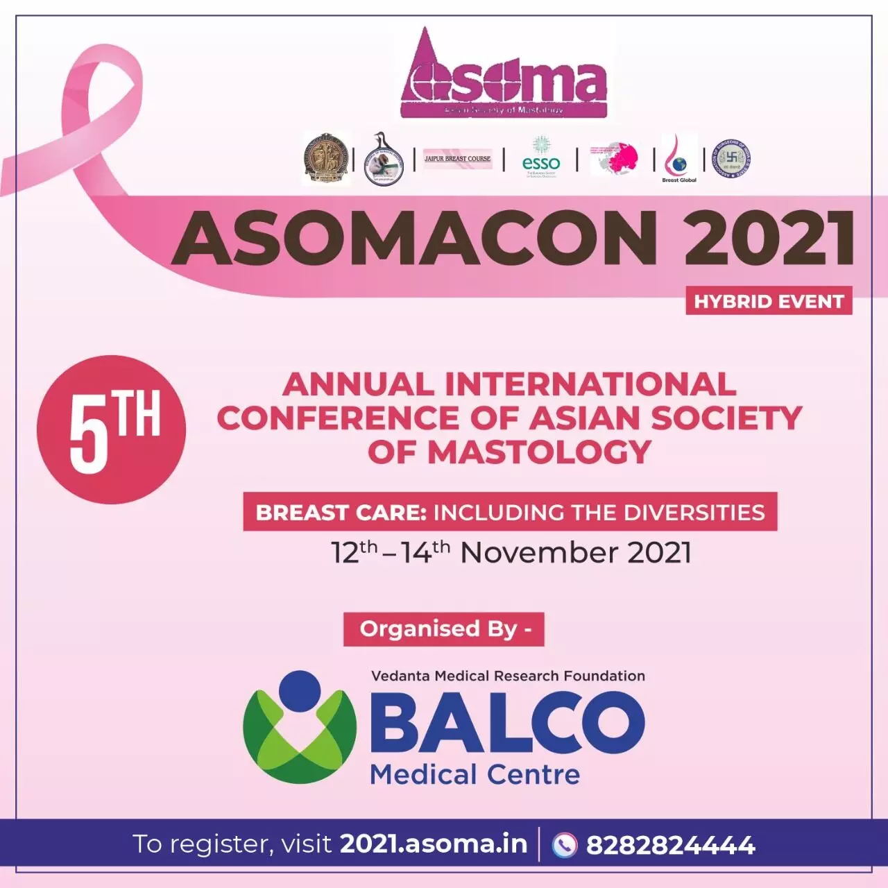रायपुर 23 अक्टूबर 2021। एशियन सोसाइटी ऑफ मास्टोलॉजी, असोमाकॉन 2021 का 5 वां अंतर्राष्ट्रीय वार्षिक सम्मेलन, बालको मेडिकल सेंटर द्वारा आयोजित किया जाएगा। इसका आयोजन 12 से 14 नवंबर, 2021 तक होटल बेबीलोन कैपिटल, रायपुर में होगा। छत्तीसगढ़ में यह स्तन देखभाल पर होने वाला पहला अंतर्राष्ट्रीय सम्मेलन है और इस प्रतिष्ठित शैक्षिक उत्सव में अंतरराष्ट्रीय और राष्ट्रीय वैज्ञानिक निकायों की सक्रिय भागीदारी होगी।