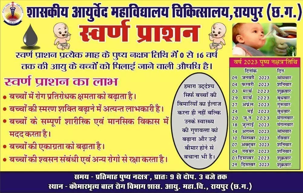 रायपुर आयुर्वेदिक कालेज के प्राध्यापक डॉ. संजय शुक्ला ने बताया स्वर्ण प्राशन कुछ स्वर्ण भस्म,शहद और इम्यूनिटी बूस्टर आयुर्वेद औषधियों का मिश्रण होता है जिसे प्रत्येक महीने के पुष्प नक्षत्र में आयुर्वेद चिकित्सा विशेषज्ञों के मार्गदर्शन में दिया जाता है।