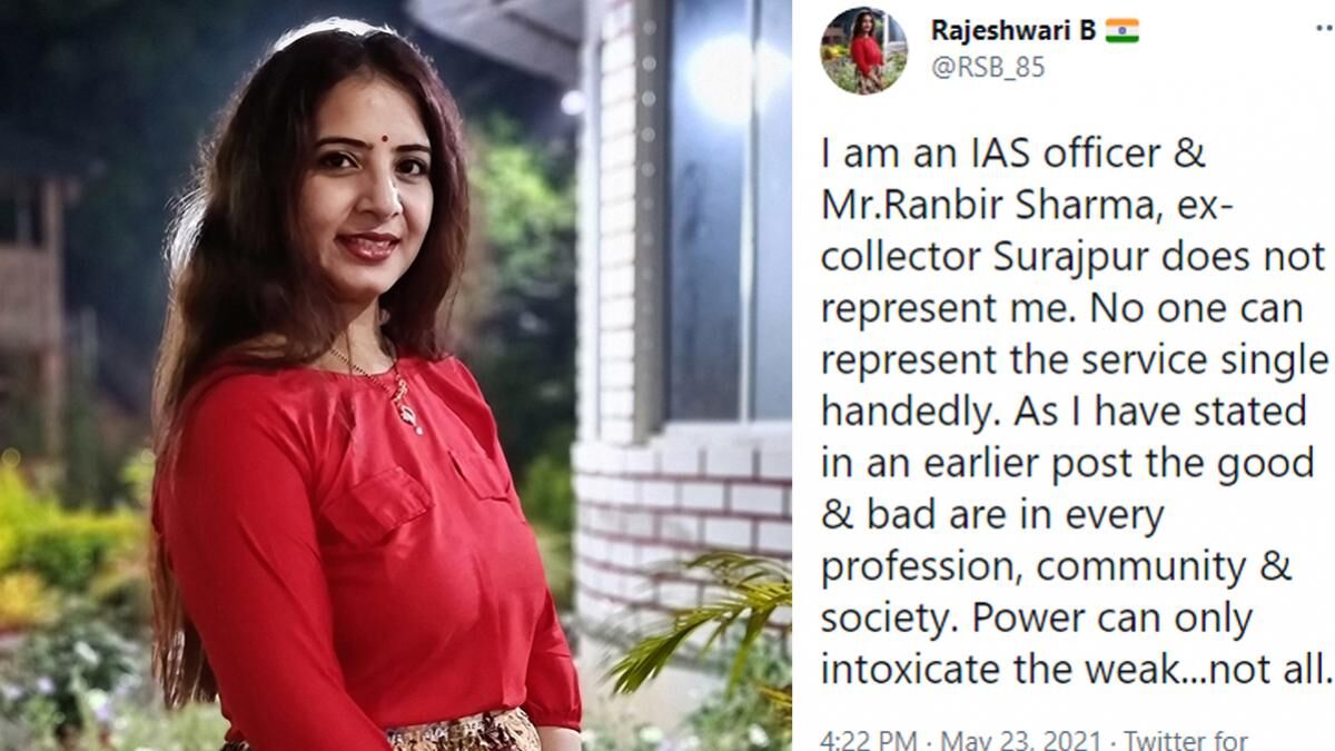 झारखंड की IAS अफसर राजेश्वरी बी ने अपने ट्वीट में लिखा- मैं एक आईएएस अधिकारी हूं. रणबीर शर्मा, पूर्व कलेक्टर सूरजपुर मेरा प्रतिनिधित्व नहीं करते हैं. पावर मिलने से कमजोर लोग बेकाबू हो सकते हैं, सभी नहीं. राजेश्वरी बी ने लिखा कि ऑफिसर के तौर पर हमें एक उदाहरण पेश करना होता है जिसे पूरा करने में वह ऑफिसर (रणबीर शर्मा) साफ तौर से फेल रहे.