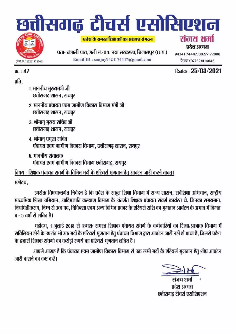 छत्तीसगढ़ टीचर्स एसोसिएशन के सभी पदाधिकारियों ने मुख्यमंत्री, मुख्यसचिव, प्रमुख सचिव पंचायत,संचालक पंचायत को ज्ञापन सौंपकर शीघ्र आबंटन जारी कर एरियर्स भुगतान की मांग अधिकारियों से की है!