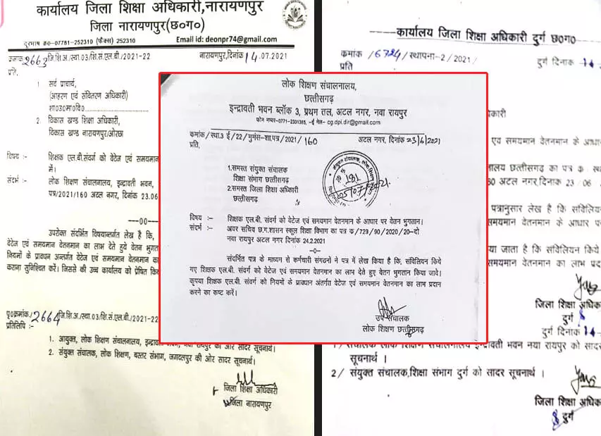 रायपुर 14 जुलाई 2021। पिछले 2 दिनों से सोशल मीडिया में एक आदेश जमकर वायरल हो रहा है और चारों तरफ इसी के चर्चे हैं यह आदेश है लोक शिक्षण संचालनालय के उपसंचालक का, जिसमें संविलियन किए गए शिक्षक एलबी संवर्ग को समयमान वेतनमान और वेटेज लाभ देते हुए वेतन भुगतान किए जाने हेतु निर्देशित किया गया है । इस पत्र के बाद दुर्ग और नारायणपुर के जिला शिक्षा अधिकारियों ने भी प्राचार्य और विकास खंड शिक्षा अधिकारियों को इसके संबंध में आदेश जारी करते हुए निर्देशित किया है कि इस आदेश का पालन करें और शिक्षकों को लाभ प्रदान कर कार्यालय को अवगत कराएं ।
