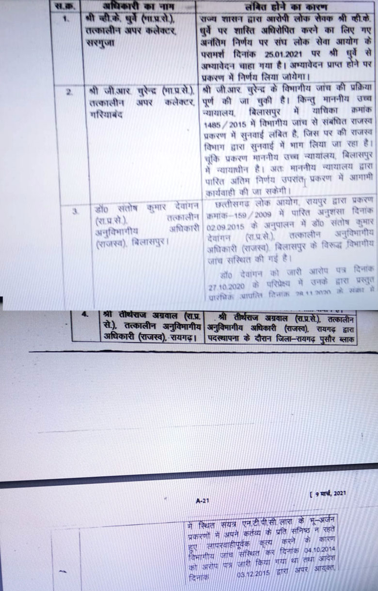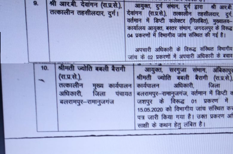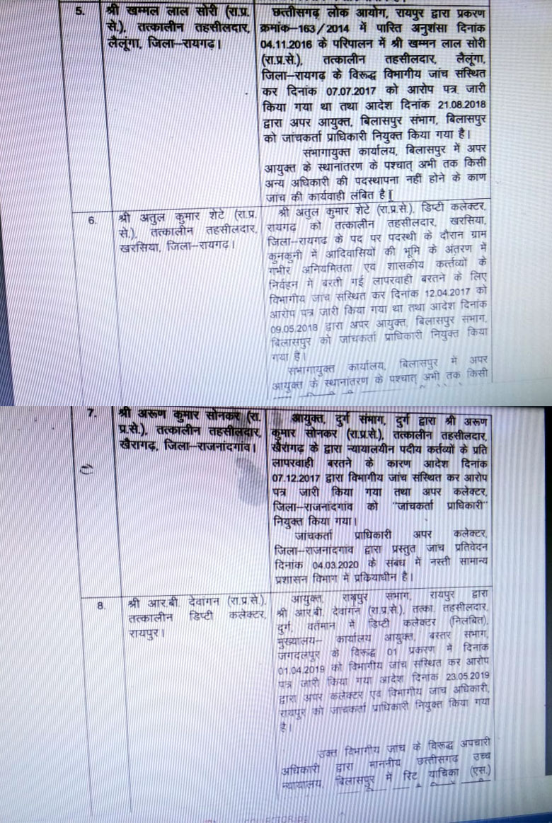 इसके अलावे राज्य प्रशासनिक सेवा के अधिकारियों में डॉ संतोष कुमार देवांगन पर एसडीएम बिलासपुर रहते, तीर्थराज अग्रवाल पर रायगढ़ में एसडीएम रहते, खम्मलाल सोरी पर लैलूंगा तहसीलदार रहते, अतुल कुमार शेटे पर खरसिया तहसीलदार रहते, अरूण कुमार सोनकर पर खैरागढ़ तहसीलदार रहते, आरबी देवांगन पर डिप्टी कलेक्टर रायपुर रहते, आरबी कलेक्टर पर ही दुर्ग तहसीलदार रहते और ज्योति बबली बैरागी पर बलरामपुर-रामानुजगंज जिला पंचायत सीईओ रहते गड़बड़ी का आरोप लगा था, जिसकी विभागीय जांच चल रही है। इनमें से कई अफसरों के खिलाफ जांच पूर्ण भी हो चुकी है।