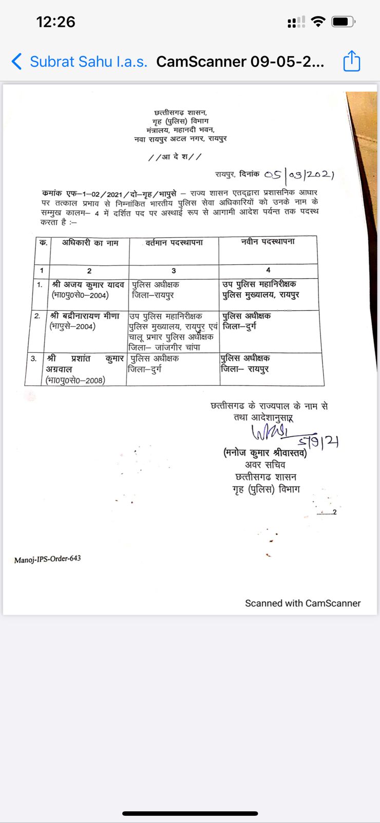 रायपुर,6 सितंबर 2021। देर रात जारी एक आदेश में तीन अहम बदलाव हुए हैं। राजधानी पुलिस की कप्तानी अब प्रशांत अग्रवाल को सौंपी गई है जबकि अब तक कप्तान रहे अजय यादव को पीएचक्यू भेजा गया है। वहीं दुर्ग के कप्तान अब बद्री नारायण मीणा होंगे।