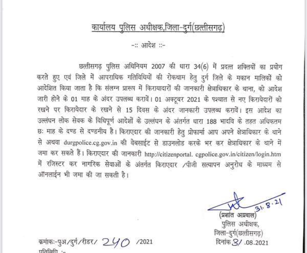 दुर्ग में हर किराएदार की जानकारी थाने में दर्ज करना अनिवार्य.. दर्ज नहीं कराए तो धारा 188 के तहत कार्यवाही तय