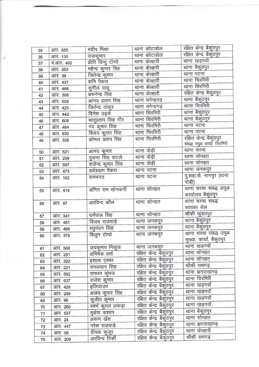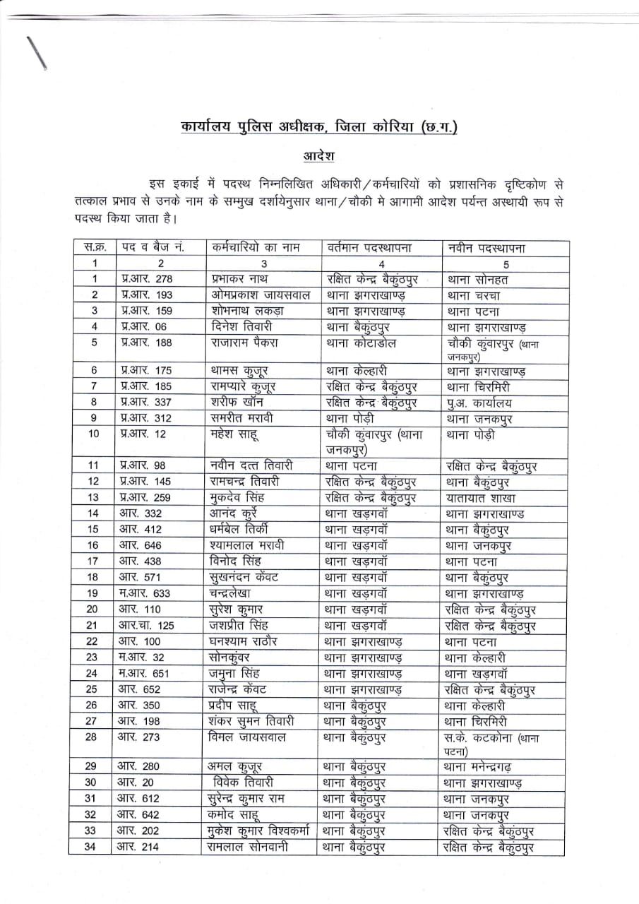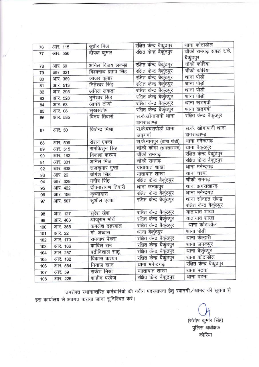 बैकुंठपुर,17अगस्त 2021। कोरिया ज़िले में तीन साल या उससे अधिक समय से एक ही जगह पदस्थ पुलिसकर्मियों का ट्रांसफ़र हुआ है। कुल 108 पुलिसकर्मियों के स्थानांतरण हुए हैं। जिनमें 13 प्रधान आरक्षक जबकि 95 आरक्षक हैं।