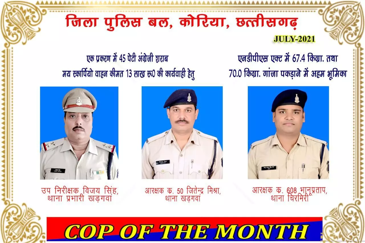 माह अगस्त 2021 में कॉप ऑफ द मंथ के लिए थाना प्रभारी खड़गवां उप निरीक्षक विजय सिंह , आरक्षक जितेंद्र मिश्रा थाना खड़गवां और आरक्षक भानूप्रताप थाना चिरमिरी को चुना गया है।