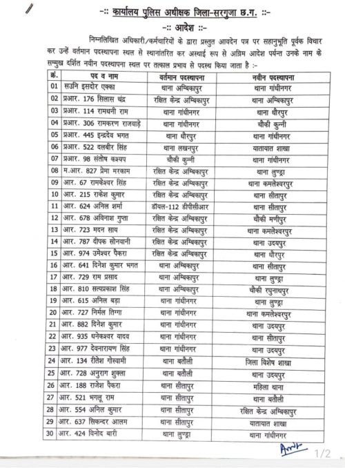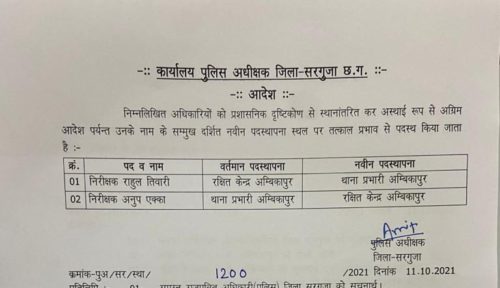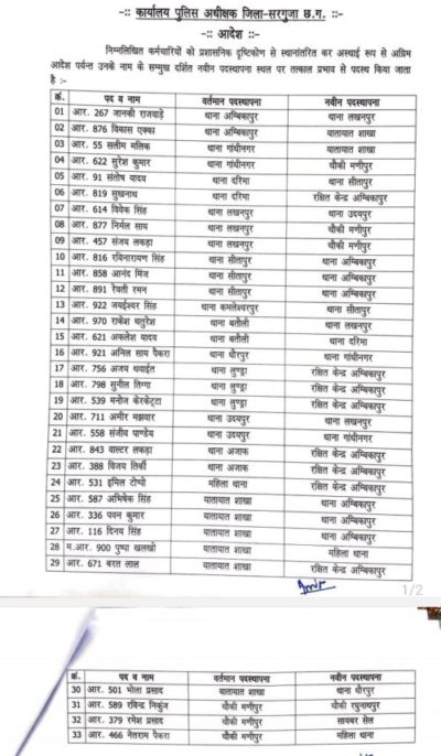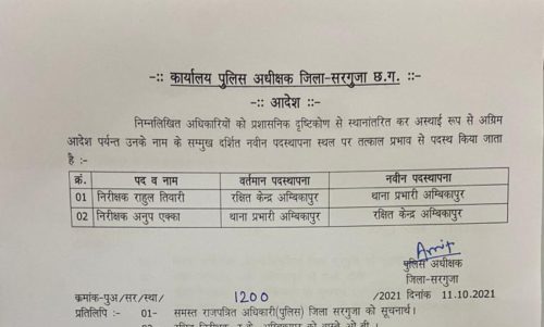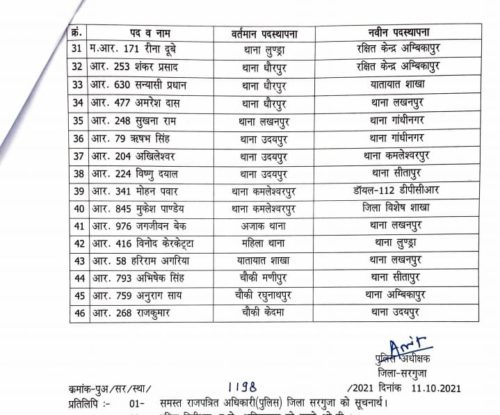 अंबिकापुर,11 अक्टूबर 2021। सरगुजा पुलिस में विभिन्न थानों में पदस्थ तैंतीस आरक्षकों को दूसरी जगह पदस्थापना दी गई है, वहीं एक ASI 6 हवलदार समेत 46 का स्थानांतरण स्पंदन कार्यक्रम के तहत किया गया है।जबकि कोतवाली टीआई के रुप में राहुल तिवारी को पदस्थ किया गया है। अब तक कोतवाली प्रभारी रहे अनुप एक्का को लाईन रवानगी दे दी गई है।वहीं बतौली में पदस्थ रहे ASI संतोष तिवारी को लाईन भेजा गया था, उन्हें अब गांधीनगर थाना पदस्थ किया गया है।