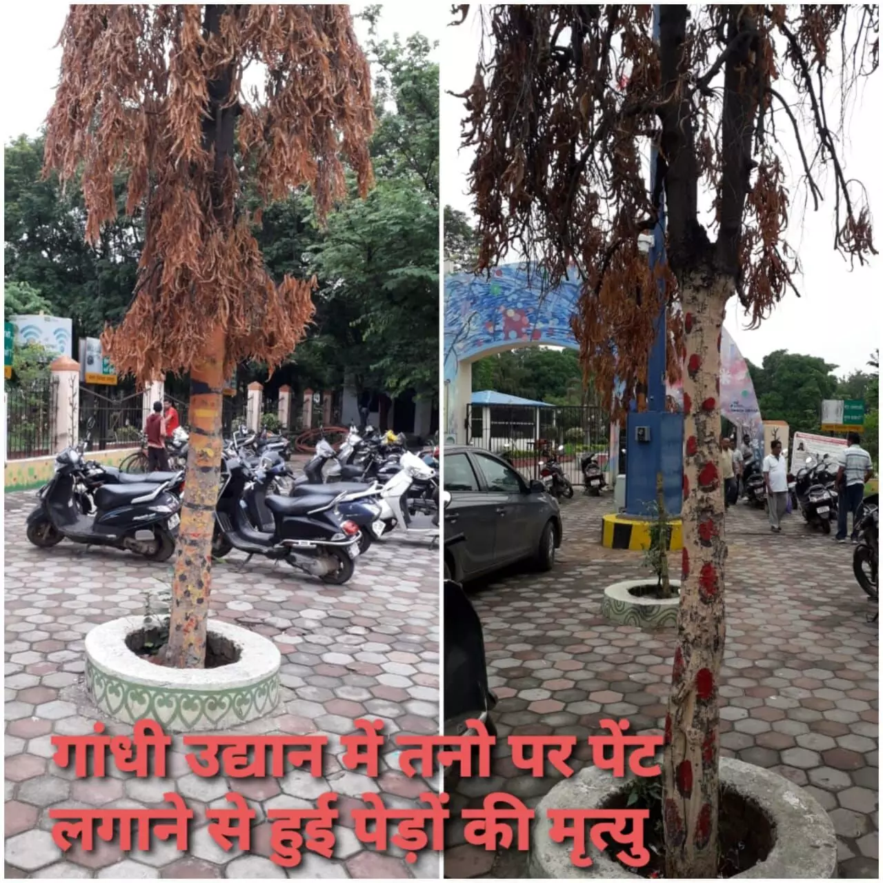 गांधी उद्यान में वृक्षों की पेंट लगने से हुई मृत्यु के फोटो मुख्य सचिव को पत्र के साथ भेजी गई जिसमे दो अशोक के पेड़ पेंट लगा कर सौंदर्यीकरण करने उपरांत मर गए.