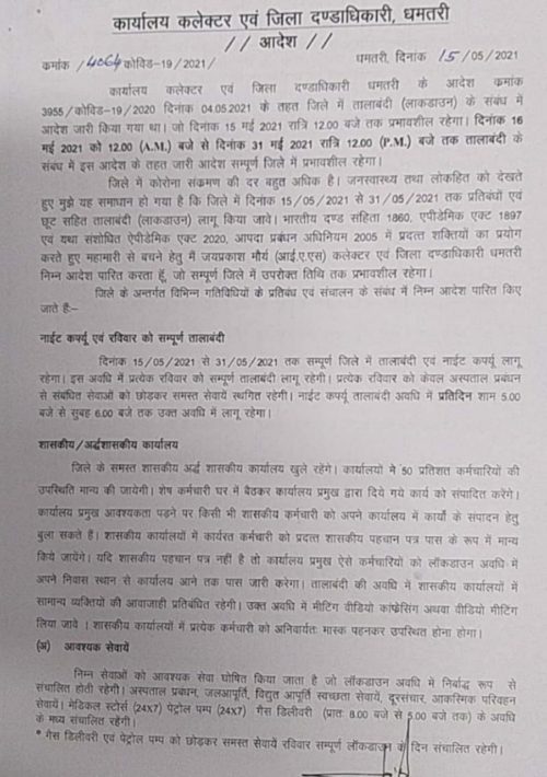 धमतरी 15 मई 2021। धमतरी में लाॅकडाउन आगे नहीं बढ़ाने के साथ शराब दुकान खुलने की खुशी मना रहे शराब प्रेमियों के लिये बुरी खबर है। कलेक्टर ने 24 घंटे के अन्दर शराब दुकान खोलने के अपने ही फैसले को अब वापस ले लिया है। इसका मतलब अब जिले में शराब दुकाने फिर से बंद रहेगी। आज जारी हुये आदेश में कलेक्टर द्वारा शराब दुकान खोलने के निर्णय को वापस ले लिया है। हालांकि इस दौरान जिले में ऑनलाइन शराब की बिक्री चालू रहेगी। CG ब्रेकिंग: शराब दुकान भी खुलेंगी, इन शर्तों के साथ लॉकडाउन भी हटाया गया… व्यापारियों संघ बैठक में कलेक्टर ने लिया निर्णय…..बता दें शुक्रवार को व्यापारियों और कलेक्टर के बीच हुई बैठक के बाद कलेक्टर जेपी मौर्या ने जिले मे लाॅकडाउन नहीं बढ़ाने का फैसला लिया था। साथ ही जिले की सभी शराब दुकानों को बाकी दुकानों के साथ ही खोलने का निणर्य भी लिया था, जिसकी जानकारी खुद कलेक्टर जेपी मौर्या ने पत्रकारों को दी थी। चूंकि आज जारी हुये आदेश में शराब दुकान को पूरी तरह से लाॅकडाउन अवधी में बंद रखने का निर्णय लिया गया है। साथ ही बार, मैरिज हाॅल, माॅल्स, धर्मशाला, क्लब, स्वीमिंग पूल, मार्केट, कोचिंग क्लास, पार्क, स्कूल, काॅलेज, पान की दुकान, सिनेमा हाॅल, नाई की दुकान, जिम और राजनीतिक, सामाजिक, धार्मिक तथा सांस्कृतिक आयोजन पर पूरी तरह से प्रतिबंध रहेगा। CG ब्रेकिंग: शराब दुकान भी खुलेंगी, इन शर्तों के साथ लॉकडाउन भी हटाया गया… व्यापारियों संघ बैठक में कलेक्टर ने लिया निर्णय…..