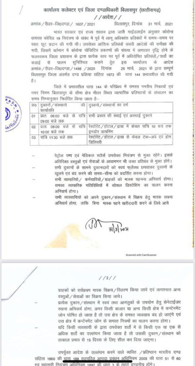बिलासपुर,31 मार्च 2021। बढ़ते कोरोना संक्रमण के बीच बिलासपुर ज़िले में भी मार्केट ब्रेक का आदेश लागू हो गया है। अब से कुछ देर पहले जारी आदेश में ज़िला प्रशासन ने बिलासपुर ज़िले में धारा 144 प्रभावी करते हुए दुकानों के चालू और बंद होने के समय को निर्धारित कर दिया है।
